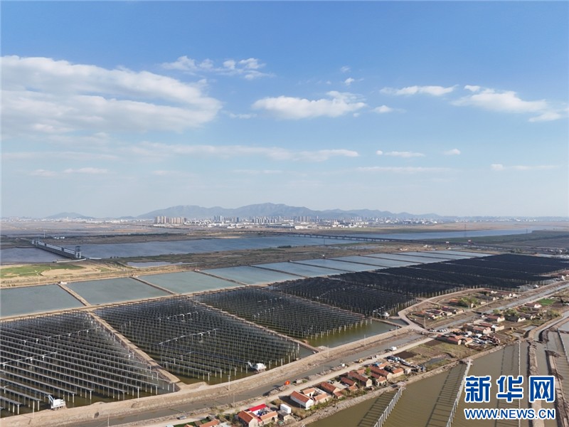 近日,在連云港經(jīng)濟(jì)技術(shù)開(kāi)發(fā)區(qū)猴嘴街道三峽青口鹽場(chǎng),近78萬(wàn)塊光伏板如波浪般起伏,深藍(lán)色板面倒映著魚(yú)塘的波光,蔚為壯觀。