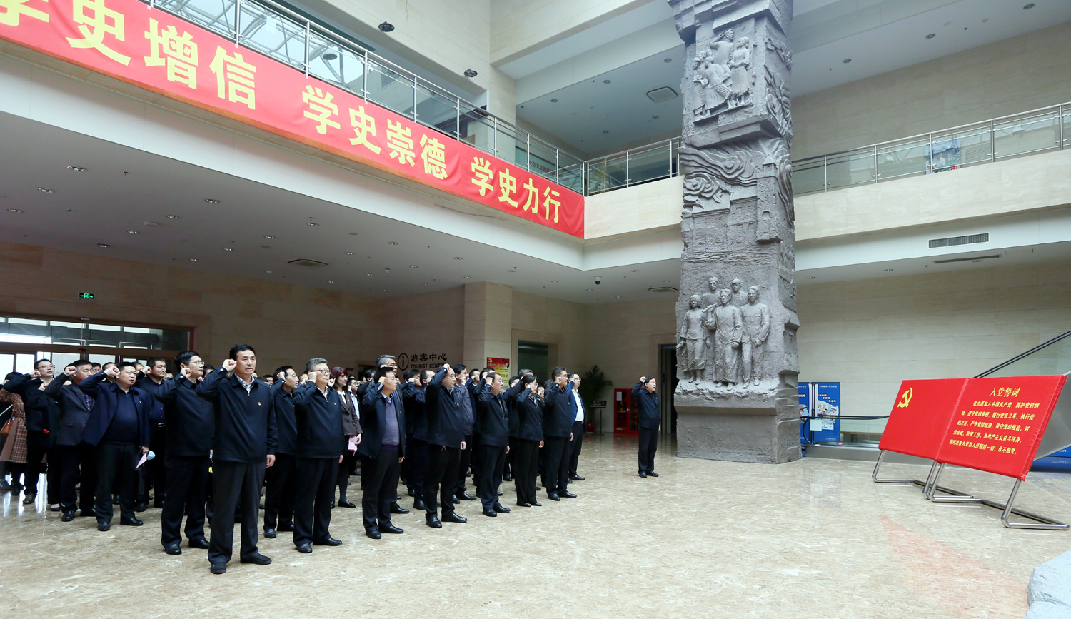 4月22日下午,集團公司黨委在市革命紀念館舉辦“學(xué)史明理守初心、砥礪奮進擔(dān)使命”黨性教育實境課堂。集團黨委班子成員,各單位黨建、紀檢、工會分管領(lǐng)導(dǎo)、黨群工作部(學(xué)教辦)負責(zé)人,集團總部助理以上管理人員80余人參加。 走進市革命紀念館,在鮮紅的黨旗下,全體黨員舉起右拳,重溫入黨誓詞,鏗鏘有力的誓詞,進一步激發(fā)黨員干部牢記黨的初心和使命。在紀念館展室,大家認真看、仔細聽,通過歷史文獻、革命文物、新聞圖片和視頻資料,真切感受到中國共產(chǎn)黨領(lǐng)導(dǎo)海屬地區(qū)人民在五四運動、土地革命、抗日戰(zhàn)爭、解放戰(zhàn)爭時期血與火的革命斗爭史。