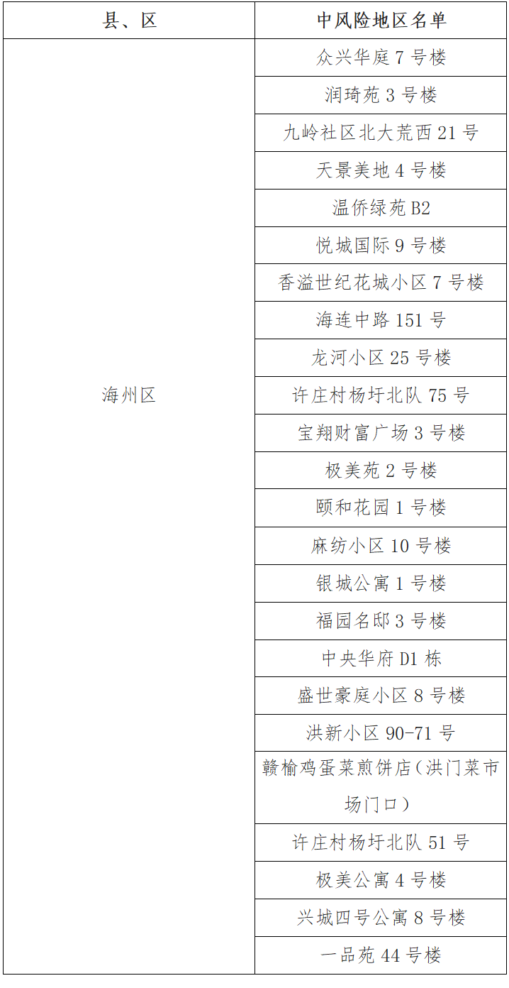 根據(jù)國務(wù)院聯(lián)防聯(lián)控機(jī)制有關(guān)規(guī)定,經(jīng)綜合評估研判,市指揮部決定,自發(fā)布之日起,將頤和花園1號樓、麻紡小區(qū)10號樓、銀城公寓1號樓、福園名邸3號樓、中央華府D1棟、盛世豪庭小區(qū)8號樓、洪新小區(qū)90-71號、贛榆雞蛋菜煎餅店(洪門菜市場門口)、許莊村楊圩北隊(duì)51號、極美公寓4號樓、興城四號公寓8號樓、一品苑44號樓調(diào)整為中風(fēng)險(xiǎn)地區(qū)。其他地區(qū)風(fēng)險(xiǎn)等級不變。調(diào)整后全市現(xiàn)有24個(gè)中風(fēng)險(xiǎn)地區(qū)。