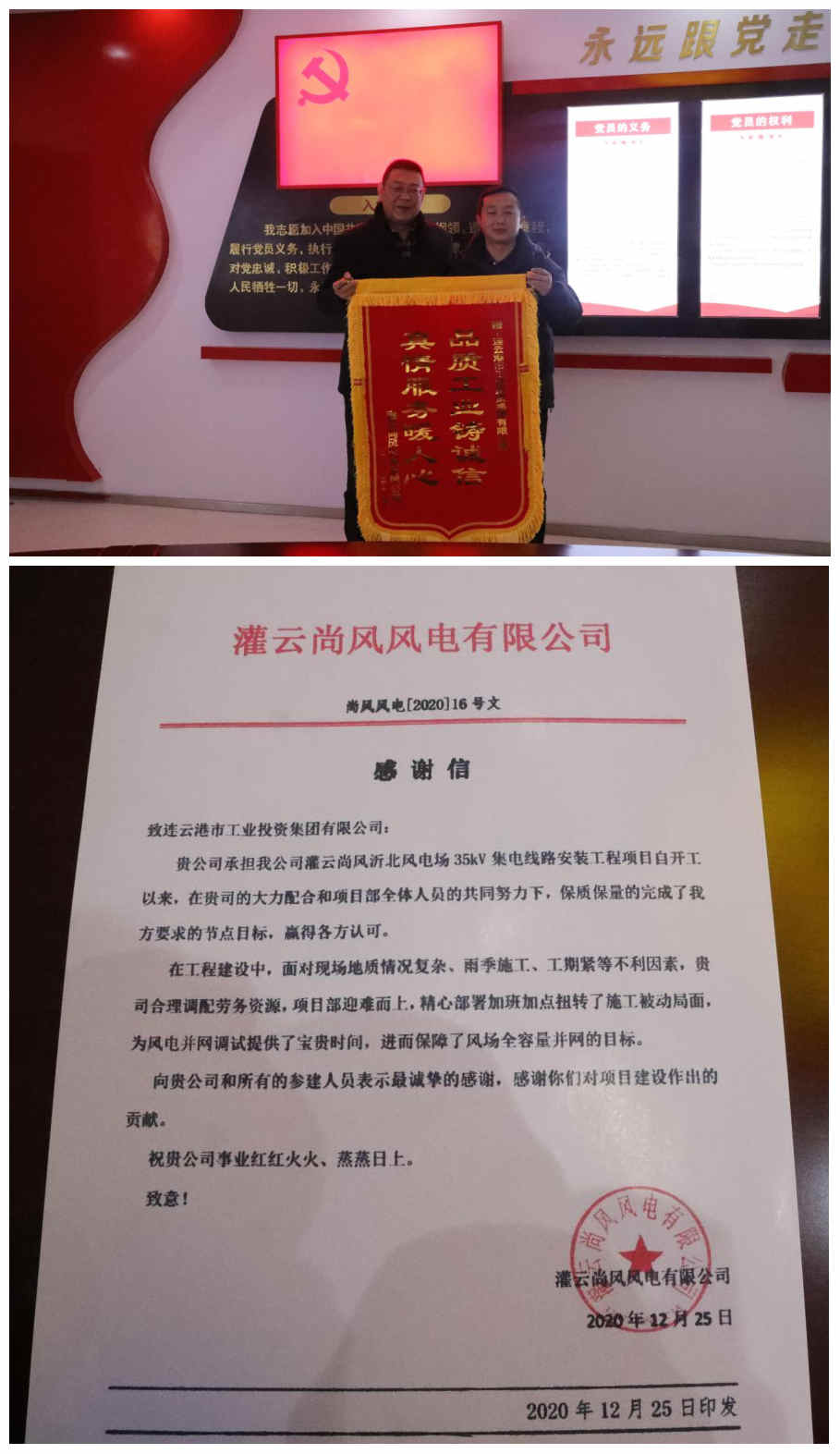 1月28日上午,灌云尚風(fēng)風(fēng)電有限公司副總經(jīng)理王現(xiàn)奇一行來到公司,授予我司一面錦旗和一封《感謝信》,以感謝半年來我司在灌云尚風(fēng)沂北風(fēng)電場35kV集電線路安裝工程項(xiàng)目中做出的貢獻(xiàn)。