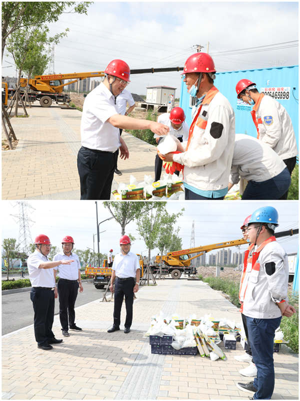 7月28日上午,集團(tuán)公司黨委副書記戴鴻鳴、工會(huì)主席劉承志一行,深入公司施工一線走訪慰問職工,把綠豆、牛奶等防暑降溫用品送到他們手中,在炎炎夏日,為一線職工送去集團(tuán)公司的深切關(guān)懷。 在臺(tái)北工地,戴書記與施工人員親切交談,簡要了解了工程的施工情況,叮囑他們在夏日高溫期間要注意安全,做好防暑降溫措施,確保安全生產(chǎn)和身體健康。(電宣)
