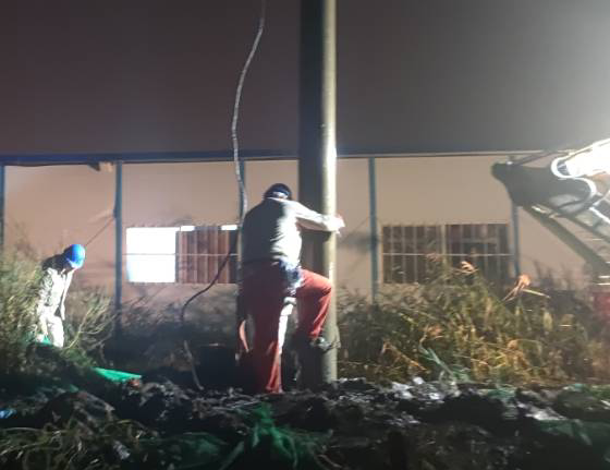 今年的10月天氣還是熱的厲害,電桿被太陽曬的滾燙,搶修人員臉上掛滿了豆大的汗珠,工作服已經(jīng)全部濕透。為了搶時間,抓進(jìn)度,作業(yè)人員們?nèi)徊活櫍廊痪o張有序地工作著。現(xiàn)場搶修工作涉及吊車、挖掘機(jī)等大型施工機(jī)具,安全管控尤為重要,現(xiàn)場所有搶修人員在工作負(fù)責(zé)人的指揮下平穩(wěn)有序的推進(jìn)搶修工作,吊車擺放位置、挖掘機(jī)挖桿洞的位置等每一個關(guān)鍵工作點都在搶修人員的嚴(yán)格監(jiān)督下進(jìn)行,不敢有絲毫松懈。就在這時,天公不作美,突然下起了大雨,可是大雨并沒有攔住搶修工作。臺北供電所現(xiàn)場所有的搶修人員在錢所長的帶領(lǐng)下,穿著濕透的工作服在雨中指揮挖掘機(jī)開挖桿洞、組立電桿、連接導(dǎo)線-------搶修人員在天昏地暗的雨中穿梭,雨水和汗水交匯在電力搶修人員的臉龐上,大家都來不急擦拭一下臉上的雨水,在雨中忙碌著。經(jīng)過4個半小時的緊張有序搶修,晚上19:30分10KV港北線恢復(fù)供電。