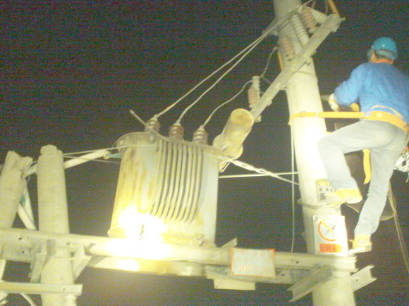 徐圩供電所立即派搶修人員趕到現場。海通攪拌站廠區(qū)事故現場,高壓桿傾斜,低壓桿折斷,變壓器高低壓樁頭全部歪曲,損壞嚴重,夜間無法修復。為盡快使其它線路恢復供電,搶修人員黑夜進行應急處理,折除了變壓器高壓引線,并作了妥善的安全保障。同時,加緊準備搶修材料、電桿及變電設備。