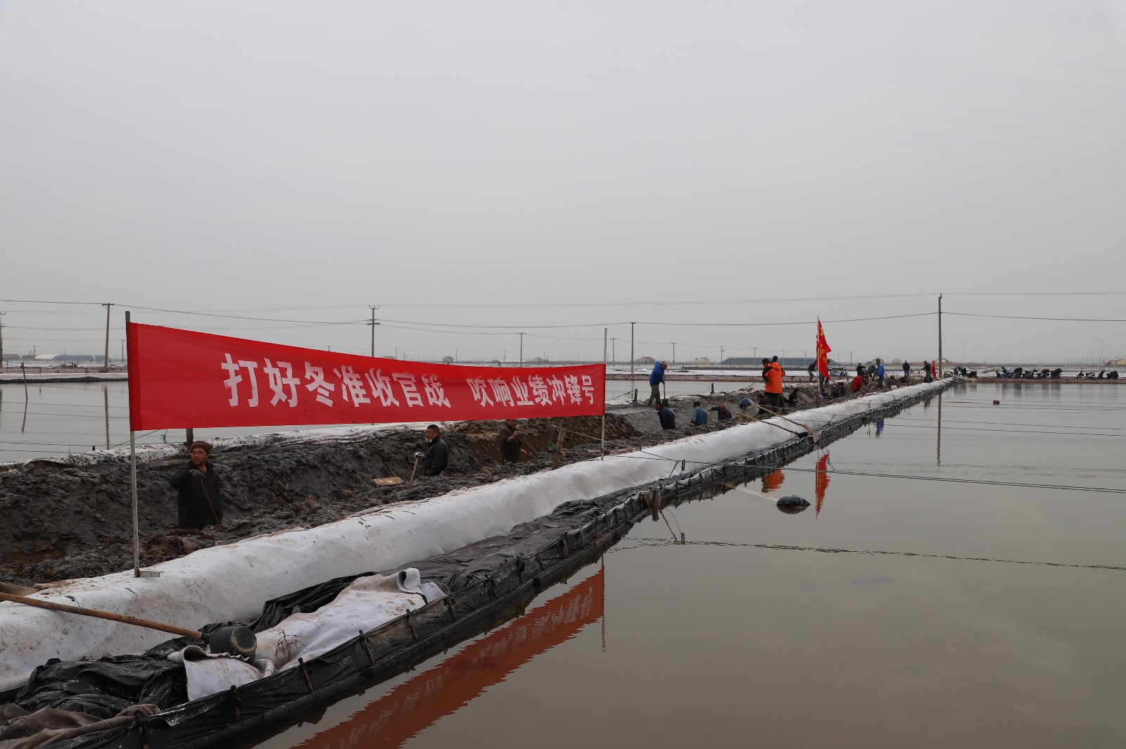 在新河制鹽分公司鹽田地頭的冬準(zhǔn)會戰(zhàn)現(xiàn)場,人頭攢動,工人們正動作嫻熟的進(jìn)行澆水、翻泥、踩實(shí)、做埝、整平……,鹽工們?nèi)幭冗M(jìn)位,手腳不停的揮鍬挖泥,呈現(xiàn)出你追我趕、比肩發(fā)力的勞動場景。一條條溝道改造、格堰修整等亮化灘場文明建設(shè)煥然一新,一幅幅“人勤春早”的美麗畫卷徐徐展開。