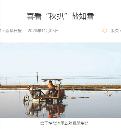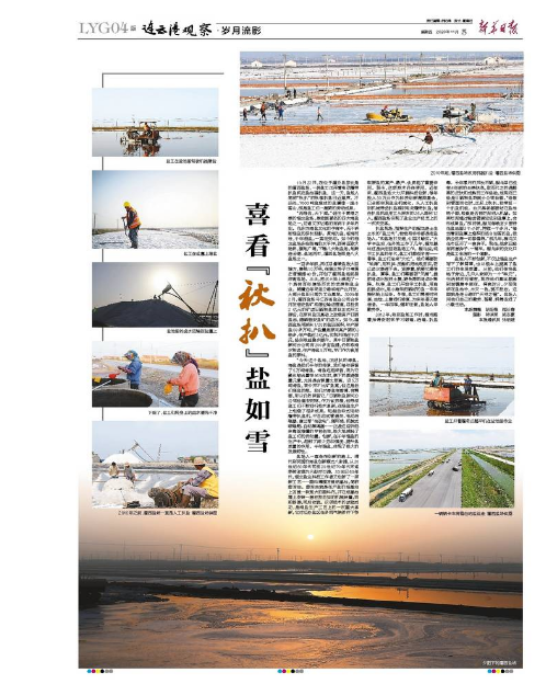“今天這個鹽池,正好扒的海鹽。海鹽是我們千年的傳承,我們每年保留了5萬噸海鹽。海鹽吃起來香,因為它氯化鈉含量在96%左右,剩下的都是微量元素,尤其是含鎂量比較高。這5萬噸海鹽,賣價并不比礦鹽高,但這是我們淮鹽的根。我們對海鹽有感情、有需要,所以仍然保留它。”日曬制鹽新河分公司經(jīng)理安樹林,作為省勞模,他帶領鹽工們不斷進行技術革新,在淮鹽生產(chǎn)上創(chuàng)造了很多成果。輕型自吸式電動履帶扒鹽機、半自動式管道架、電動活碴器、唐三零“油改電”、循環(huán)纜、機械式破碴耙、自動解繩器……正是這些聽起來晦澀難懂的專有名詞,極大地減輕了鹽工們的勞動量。創(chuàng)新,在千年淮鹽的生產(chǎn)中,起到了減少勞動強度、提升鹽質(zhì)量的作用。千年淮鹽,體現(xiàn)了極大的發(fā)展韌性。