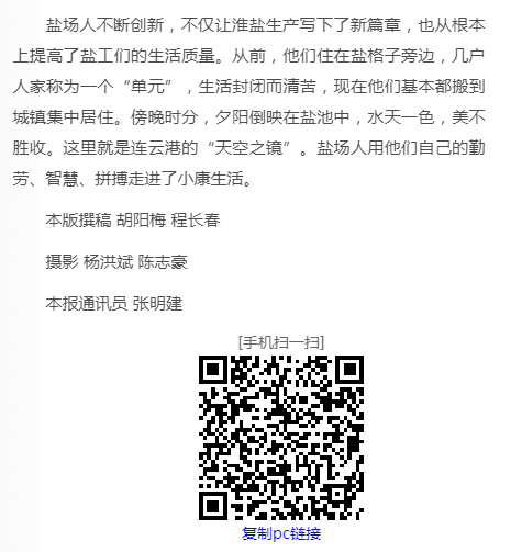 鹽場人不斷創(chuàng)新,不僅讓淮鹽生產(chǎn)寫下了新篇章,也從根本上提高了鹽工們的生活質(zhì)量。從前,他們住在鹽格子旁邊,幾戶人家稱為一個“單元”,生活封閉而清苦,現(xiàn)在他們基本都搬到城鎮(zhèn)集中居住。傍晚時分,夕陽倒映在鹽池中,水天一色,美不勝收。這里就是連云港的“天空之鏡”。鹽場人用他們自己的勤勞、智慧、拼搏走進了小康生活。