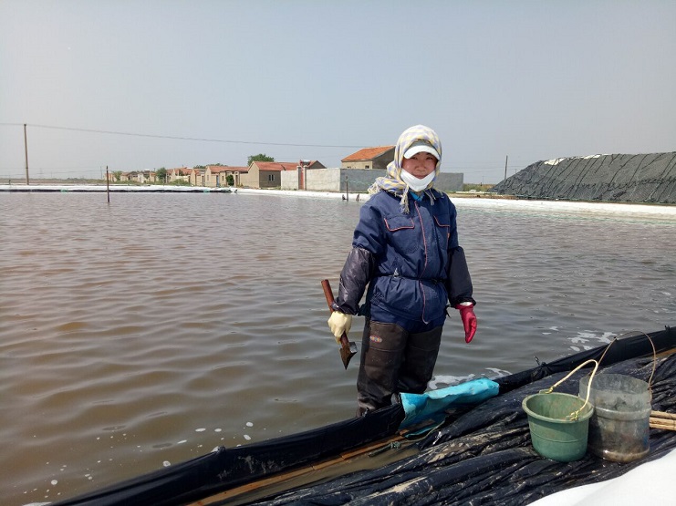 實(shí)業(yè)公司制鹽分公司廣大員積極推進(jìn)海鹽基地建設(shè),最近利用有利天時(shí)、高蒸發(fā)量搶制鹵水,起早貪黑忙著走水制鹵,整理塑灘。二班女工皮晶晶工作勤懇認(rèn)真,正忙著在塑池內(nèi)裝塑布,釘壓條,她是海鹽基地上一朵美麗的“鹽花”。(史祥燕)