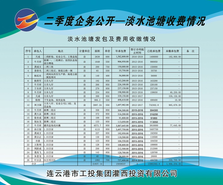 2、海水養(yǎng)殖池塘發(fā)包及費用收繳情況。共發(fā)包海水養(yǎng)殖池塘面積13073.83畝,應(yīng)收租賃費421.787萬元,已收租賃費221.39萬元,欠收租賃費200.397萬元,收繳率為52%。
