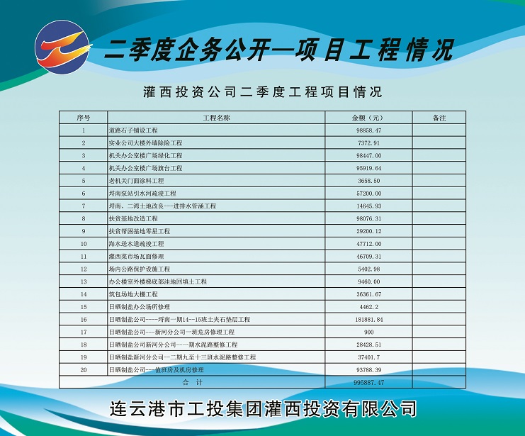 道路石子鋪設(shè)工程98858.47元;實業(yè)公司大樓外墻除險工程7372.91元;機(jī)關(guān)辦公樓廣場綠化工程98447.00元;機(jī)關(guān)辦公室樓廣場旗臺工程95919.64元;老機(jī)關(guān)門面涂料工程3658.50元;埒南泵站引水河疏浚工程57200.00元;埒南、二灣 土地改良—進(jìn)排水管涵工程14645.93元;扶貧基地改造工程98076.31元;扶貧幫困基地零星工程29200.12元;海水送水道疏浚工程47712.00元;灌西菜市場瓦面修理46709.31元;場內(nèi)公路保護(hù)設(shè)施工程5402.98元;辦公樓室外樓梯底部洼地回填土工程9460元;筑包場地大棚工程36361.67元;日曬制鹽辦公場所修理4462.2元;日曬制鹽公司---埒南一期14—15班土夾石墊層工程181881.84元;日曬制鹽公司---新河分公司一班危房修理工程900元;日曬制鹽公司新河分公司—一期水泥路整修工程 28428.51元;日曬制鹽新河分公司一二期九至十三班水泥路整修工程37401.7元;日曬制鹽公司---值班房及機(jī)房修理93788.39元