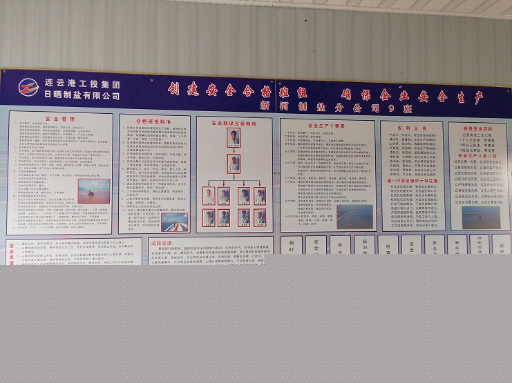 10月21日上午,連云港工投集團安全部胥廣會總監(jiān)一行三人,在灌西投資公司運營部李長軍部長的陪同下,對新河制鹽分公司9班安全軟硬件臺賬,班組設備安全,班組制鹽工、扒鹽工、維護工崗位職責,各種操作規(guī)程等進行初步檢查驗收。胥總監(jiān)認為,9班班組安全硬件設施到位,各種崗位操作規(guī)程齊全,不同崗位職責明確,是我到基層單位檢查班組安全硬件設施想像不到的好。他同時指出班組安全臺賬還需進一步增補。他們一行3人,當看到新河9班班組生產(chǎn)工具、勞保護具,值班室生活設施,上下班佩戴的頭盔,擺放整齊劃一時,滿意地說,就這樣好,有安全合格班組的模樣。(新河制鹽)