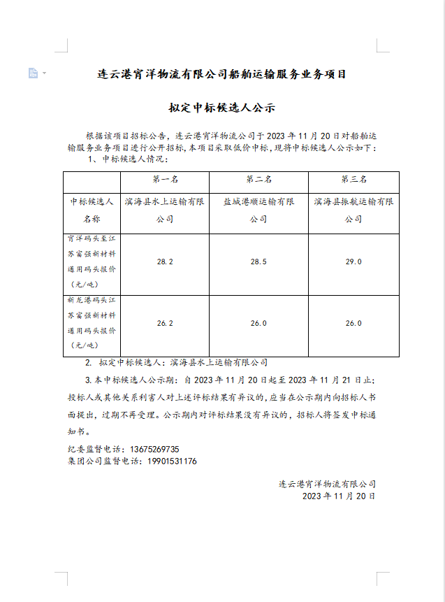 連云港宵洋物流有限公司船舶運輸服務業(yè)務項目擬定中標候選人公示