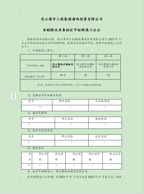 連云港市工投集團灌西投資有限公司水稻轉(zhuǎn)運業(yè)務(wù)擬定中標候選人公示