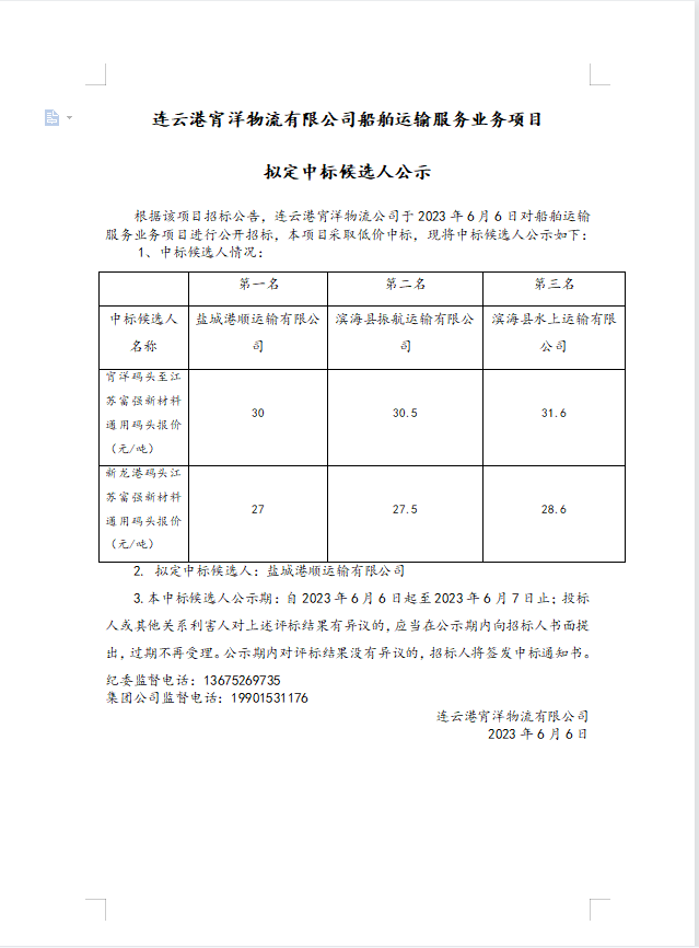 連云港宵洋物流有限公司船舶運輸服務業(yè)務項目擬定中標候選人公示