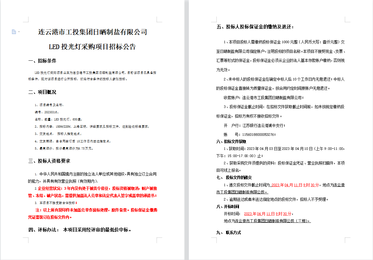 連云港市工投集團日曬制鹽有限公司LED投光燈采購項目招標(biāo)公告