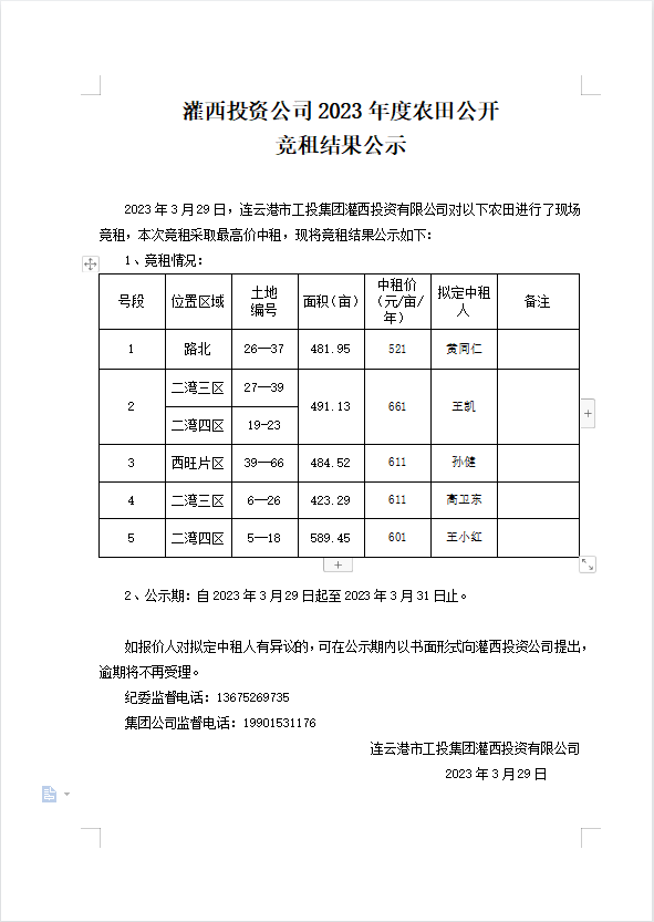 灌西投資公司2023年度農(nóng)田公開 競租結(jié)果公示