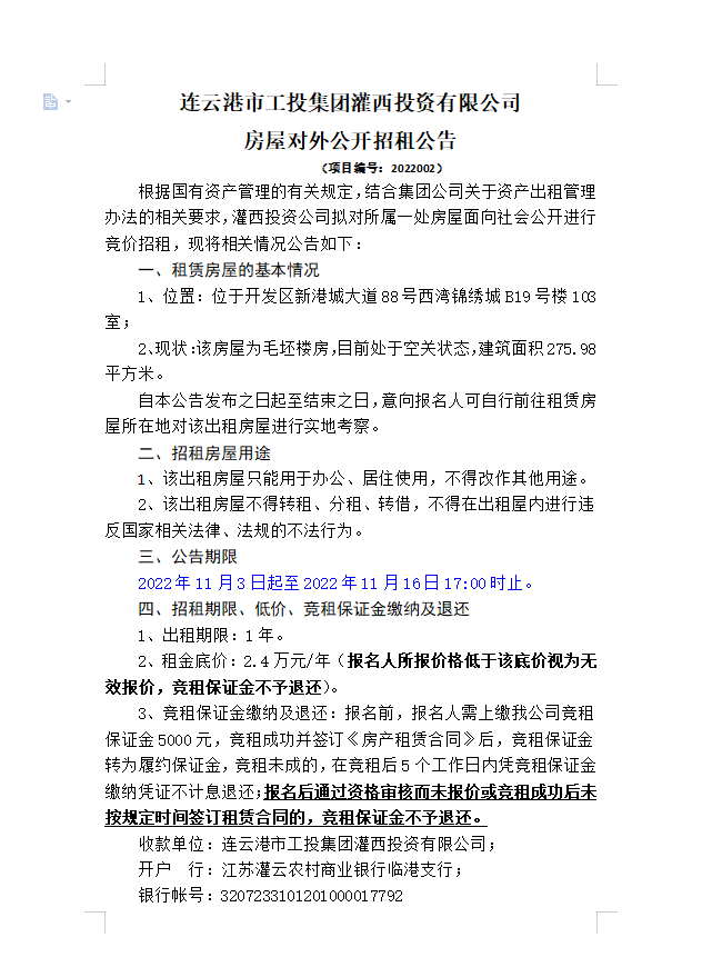 連云港市工投集團(tuán)灌西投資有限公司房屋對外公開招租公告