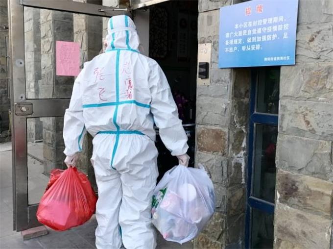 黨委工作部、工會(huì)干事張飛正在為社區(qū)居民配送生活必需品