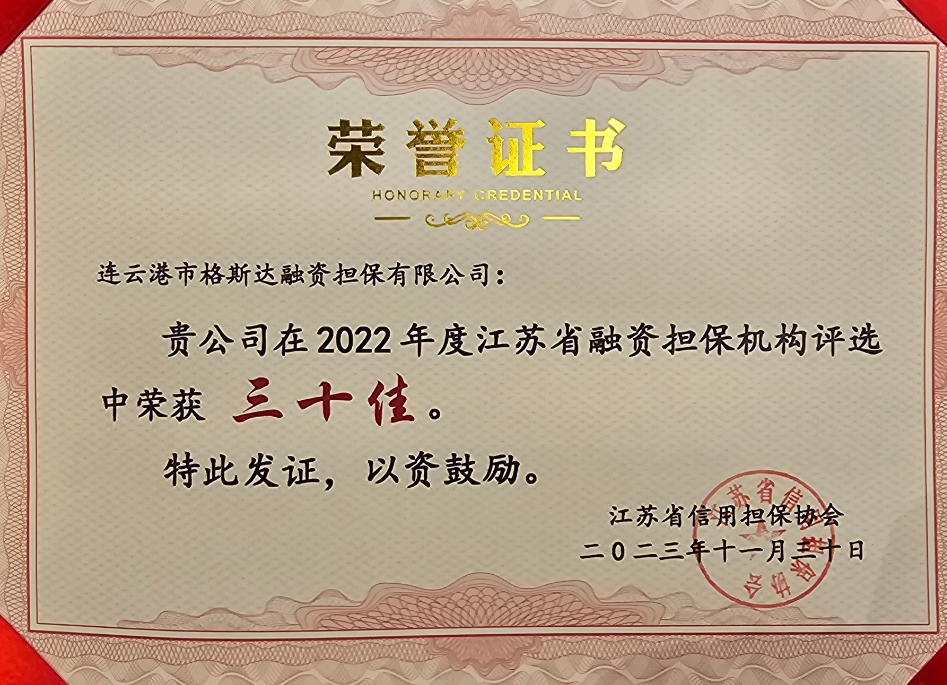 ??3月23日,江蘇省信用擔(dān)保協(xié)會在南京召開會議。連云港市格斯達(dá)融資擔(dān)保有限公司被授予“江蘇省2022年度融資擔(dān)保機(jī)構(gòu)三十佳”榮譽(yù)。本次全省共有71家融資擔(dān)保機(jī)構(gòu)參加評選,格斯達(dá)擔(dān)保公司成功入選。