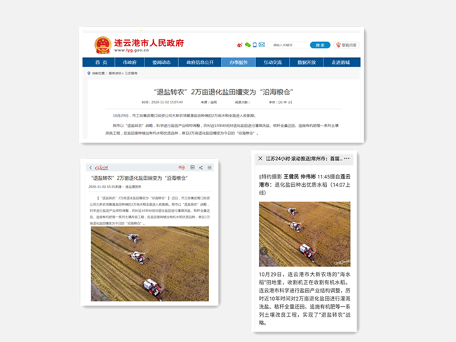 今年收割期間,人民網、光明網、江蘇24小時、連云港市人民政府網、連云港日報連續(xù)報道了我公司鹽堿地水稻豐收、秸稈綜合利用等工作舉措。我公司在現代農業(yè)發(fā)展和生態(tài)文明建設中取得的成就受到了媒體廣泛關注。(青宣)