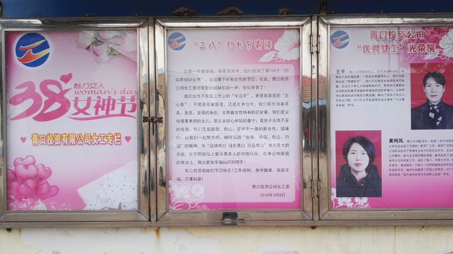 為表彰先進(jìn),樹立典型,激發(fā)女工們爭(zhēng)先創(chuàng)優(yōu)的意識(shí), “三八”節(jié)前夕,青口公司女工委開展了“優(yōu)秀女工”評(píng)選活動(dòng),對(duì)評(píng)選出來(lái)的優(yōu)秀女工加大了宣傳力度,并增設(shè)“三八”節(jié)櫥窗專欄,大力宣揚(yáng)公司先進(jìn)女工事跡。
