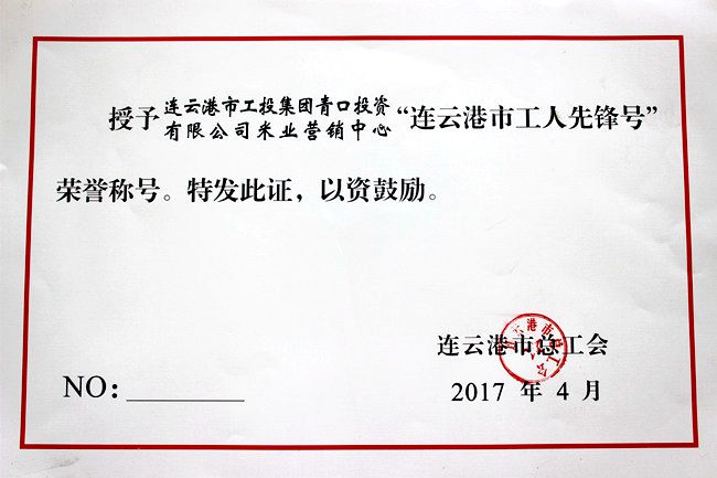 近日,公司米業(yè)營銷中心在連云港市總工會組織的 “2017年度連云港市工人先鋒號”評選活動中,被授予“工人先鋒號”榮譽稱號。