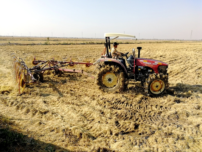 為有效防止秸稈焚燒形成的污染,保護生態(tài)環(huán)境,促進秸稈綜合利用。日前,大新農(nóng)場在水稻收割的同時積極聯(lián)系秸稈回收廠家,對水稻秸稈進行回收打包。稻田里,帶有八個圓形大齒輪的水稻摟草機正在工作,機器行駛在收割完的稻田中,將聚攏后的秸稈進行打捆作業(yè),所過之處水稻秸稈被卷起,變成從機械后面“吐”出的一個個圓形稻草捆。通過秸稈回收,將大大降低秸稈焚燒安全隱患和環(huán)境污染問題。 (大新農(nóng)場)