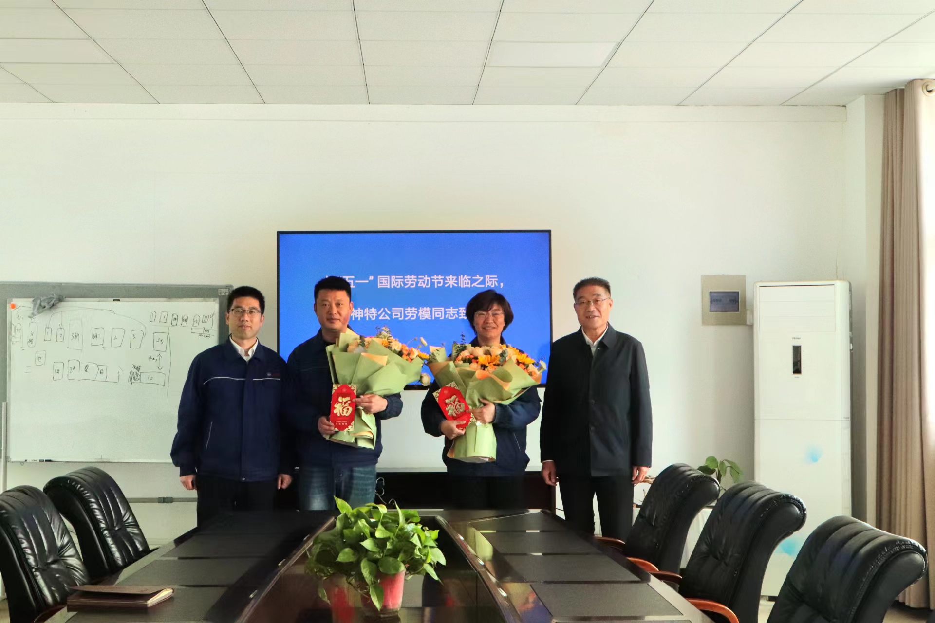 劉總與兩名市勞模面對面交流,傾聽他們的心聲和意見,感謝他們長期以來為企業(yè)發(fā)展作出的貢獻(xiàn),并獻(xiàn)上一束鮮花、送上一份慰問、表達(dá)一段祝福。