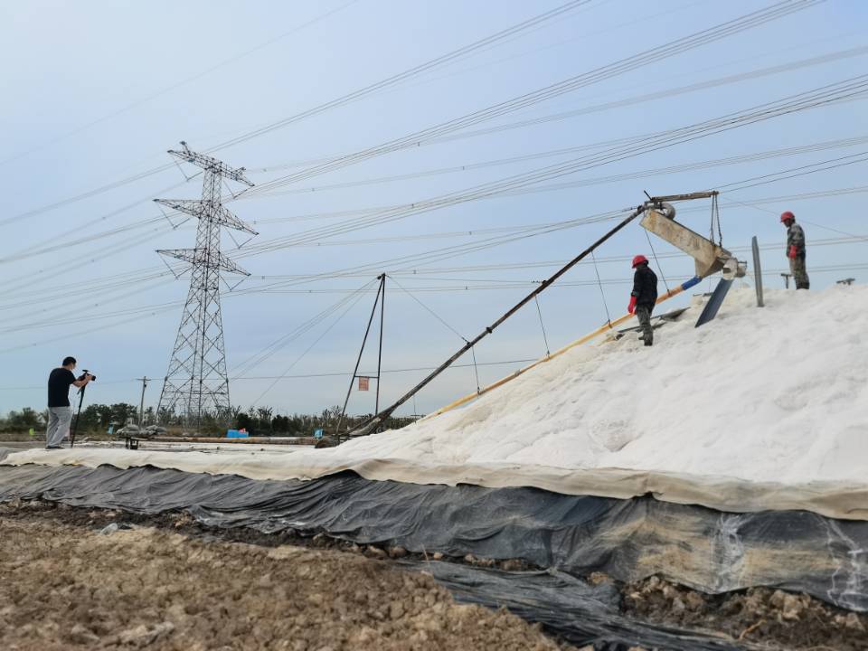 九月的鹽場,鹽田銀光閃閃,高壓電線凌空飛架,水泵房池星羅棋布,制鹽機(jī)械轉(zhuǎn)動轟鳴,一座座白花花、明晃晃的鹽廩,遠(yuǎn)看有如干凈、潔白的雪山,景象十分美麗。9月27日,連云港日報社新媒體中心采訪組一行,來到臺北海州灣公司制鹽現(xiàn)場,進(jìn)行“奮斗十年,難忘一刻”喜迎二十大專題欄目的拍攝,投資公司黨委書記、董事長、總經(jīng)理王德志陪同。