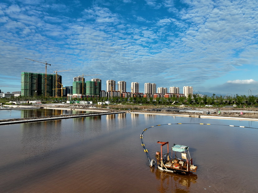 秋高氣爽,這片百年的原鹽生產(chǎn)基地進(jìn)入了收獲的旺季,一臺(tái)收鹽車(chē)在曬鹽池中進(jìn)行收鹽作業(yè)。