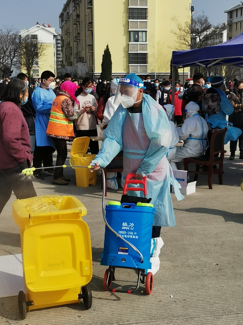 ▲海州區(qū)幸福路街道“最美大白”秦英(公司內退黨員)在工作中