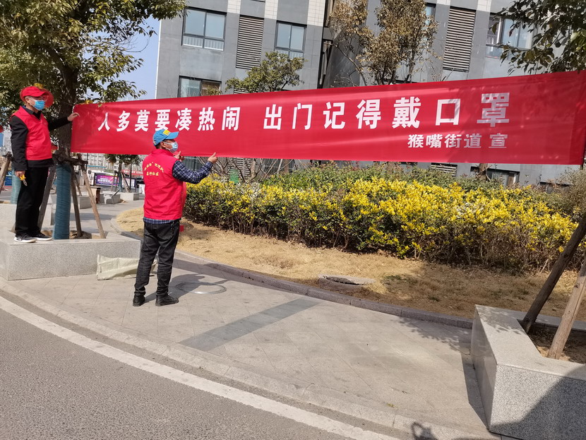 ▲昌圩社區(qū)臨時黨支部書記李明,黨員骨干于洪亮懸掛疫情宣傳標語。