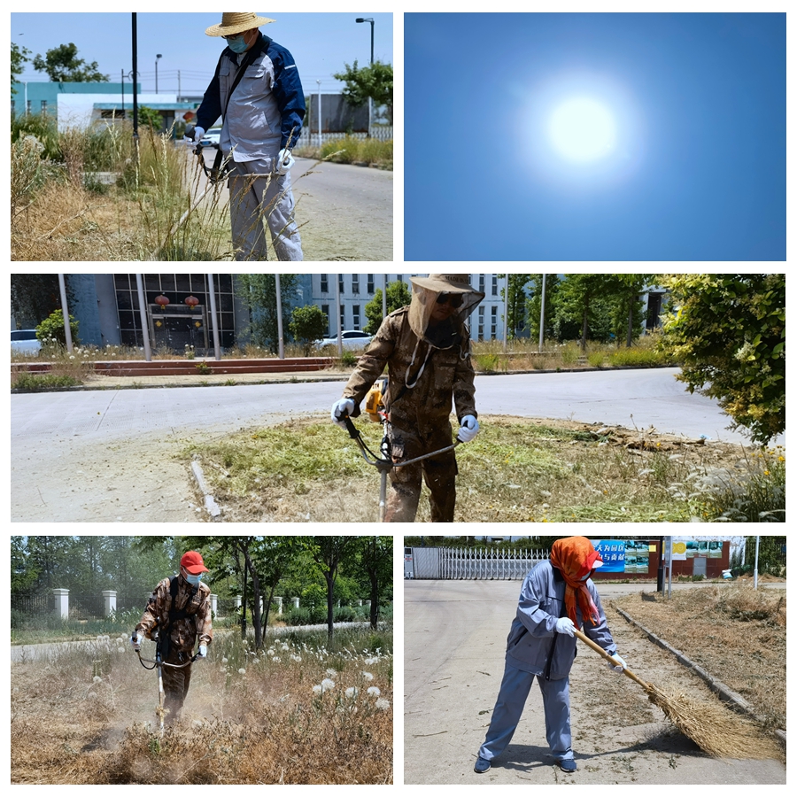 頭頂著炎炎烈日、忍受著蚊蟲叮咬,大伙使用打草機(jī)、鐮刀等工具,對(duì)雜草、高草進(jìn)行割除。走近細(xì)看,他們的臉上和手臂上都布滿汗珠,衣服早已濕透貼在身上。除草過程中,草渣紛紛濺到他們的身上,但這絲毫沒能影響他們工作的節(jié)奏。伴隨著機(jī)器的轟鳴聲,一片片規(guī)格一致、邊緣平直的綠草坪映入眼簾,淡淡的清香綠草味撲鼻而來,整個(gè)綠地充斥著整潔的氣息。