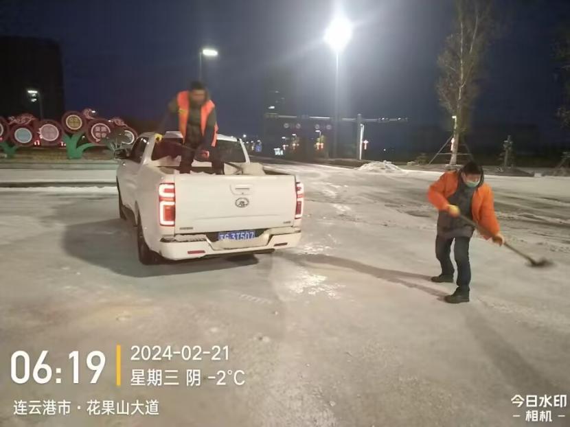 凌晨3點,葛中仁、孫銀、薛興華、伏廣軍奮戰(zhàn)在花果山大道除雪現(xiàn)場,由于冰凍嚴重、路面濕滑,工程車行進過程中舉步維艱,他們互相配合、齊心協(xié)力,時刻關注路面情況,確保道路無積雪、無結冰。