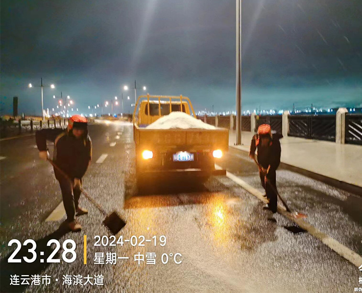 該公司迅速啟動(dòng)突發(fā)天氣應(yīng)急保障預(yù)案,近30余名道路應(yīng)急排險(xiǎn)突擊隊(duì)員,在公司統(tǒng)一按排下 ,裝車備運(yùn)融雪鹽斤近15噸,現(xiàn)場工作中隊(duì)員們士氣高漲,無所畏懼。夜間8時(shí)左右,10余名黨員先鋒,兵分三路再次安全有序奔赴燒香河、海濱大道、228等路段橋梁,無懼大風(fēng)夾著冰雨顆粒吹打臉頰,兩人一對、三人一組、揮動(dòng)手中鐵銑,汗水與冰雨濕透橙色衣衫,經(jīng)過近4個(gè)多小時(shí)努力奮戰(zhàn),人工撒放融雪鹽斤近20余噸,高質(zhì)高效保障近30座橋梁安全通暢。