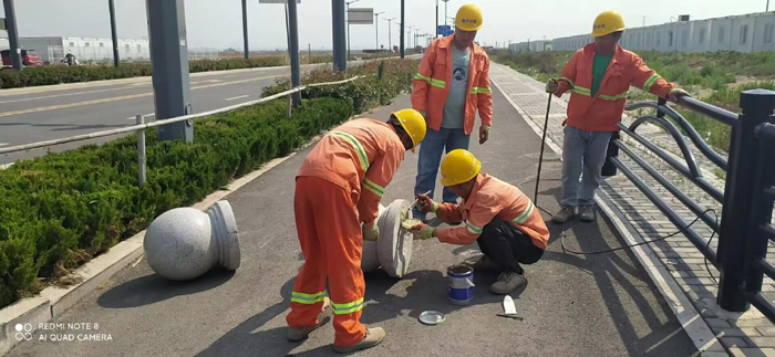 維修班組成員經(jīng)過多日實地考察,結(jié)合道路現(xiàn)場實際情況制定了維修計劃,并對部分道路上擋車樁點位、間距設(shè)置進行了合理調(diào)整,來規(guī)避擦碰現(xiàn)象發(fā)生。在石化三路一處施工現(xiàn)場,兩組隊員頂著炎炎烈日正在非機動車道上進行擋車柱安裝工作,他們配合默契,利用開孔鉆、鐵锨等工具開孔、清掏、埋設(shè)樁柱,然后用混凝土填充、壓實地下部分,最后整平路面。安裝好之后將有效阻止機動車隨意占用人行通道,達(dá)到安全目的。本次施工共安裝維修擋車柱36個、穩(wěn)固球狀擋車石約180多處。